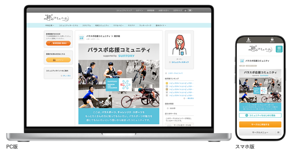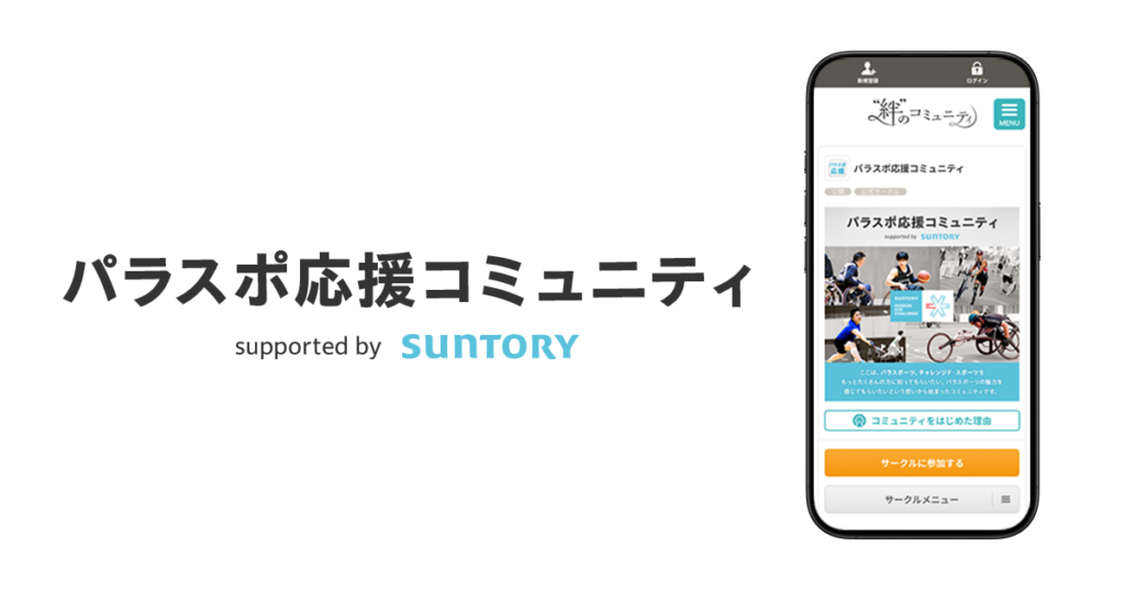 「パラスポ応援コミュニティ Supported by SUNTORY」が開設された「“絆”のコミュニティ」は2020年1月にオープンした、クオンが運営するオンライン上のファンコミュニティプラットフォームです。80以上の企業・自治体と200万人を超える生活者が集い、“絆”をテーマにした交流や、参画企業・団体のコラボレーション企画、双方向コミュニケーションから生まれる生活者の声をもとにした価値共創のイベントなどを実施しています。